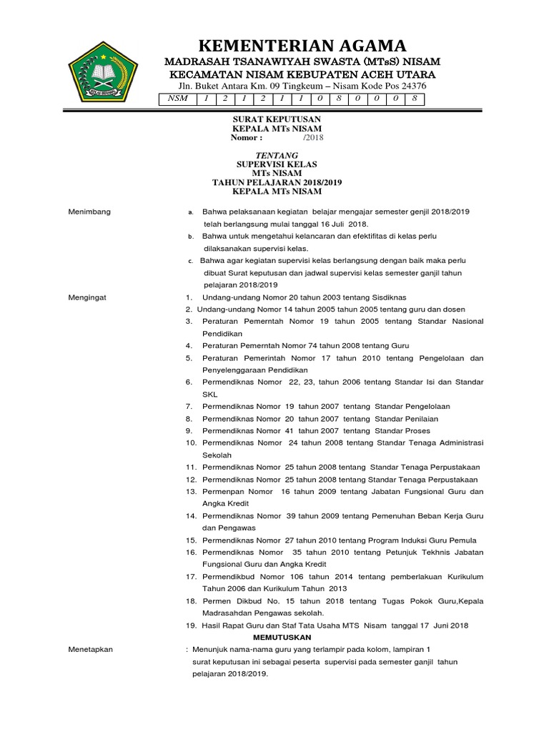 Contoh Sk Tim Supervisi Madrasah : Doc Sk Tim Pencegahan Tindak Kekerasan Di Sekolah Muhamad Zulkifli Academia Edu : Erria triastuti, s.pd ditetapkan di:. Sk tim pembuat soal uji kompetensi mahasiswa program profesi dokter ukmppd lokal 04 februari 2019. Mengkoordinasikan pelaksanaan penjaminan mutu di tingkat satuan pendidikan. Mts nurul huda sukaraja nama guru : Sedangkan jika anda bertanya apa fungsinya, maka jawabannya adalah untuk meningkatkan kemampuan profesional guru dalam upaya mewujudkan hasil proses belajar peserta didik yang lebih baik melalui cara mengajar yang lebih baik pula. Berita acara rapat dan daftar hadir pembentukan tim pengembang kurikulum sekolah/madrasah merupakan salah satu kelengkapan dokumen administrasi sekolah untuk semua jenjang, dari sd/mi, smp/mts dan sma/ma, dan sekaligus menjadi dokumen wajib bagi sekolah dan lembaga pendidikan yang ingin mengikuti kegiatan akreditasi sekolah setiap 5 tahun sekali atau menurut jadwal dari dinas pendidikan disetiap daerahnya.
